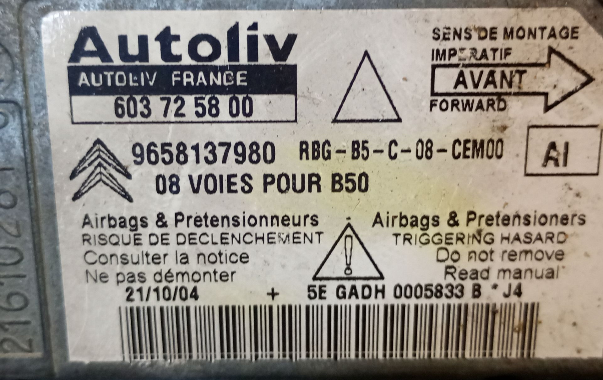 - Код производителя: 603725800AUTOLIV