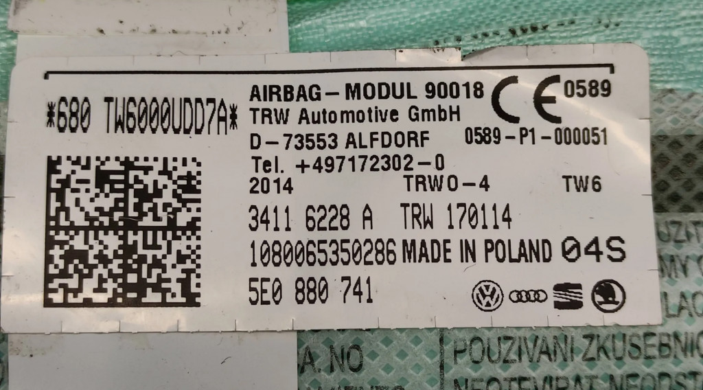 Боковая подушка безопасности 5E0880741, 34116228A Skoda Octavia Mk3 (5E)