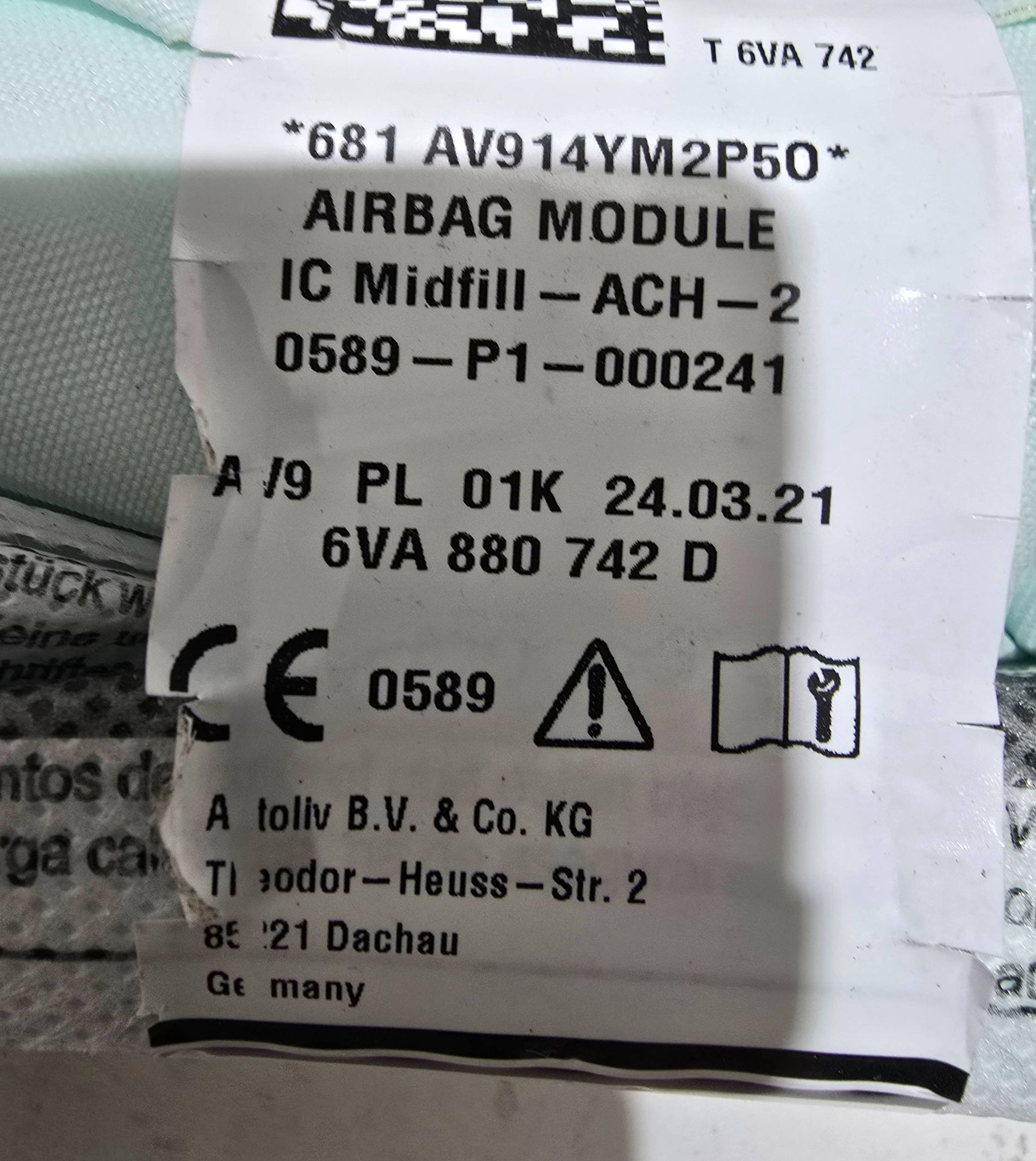 Боковая подушка безопасности 6VA880742D, 0589P1000241 Skoda Fabia Mk4 (6VA)