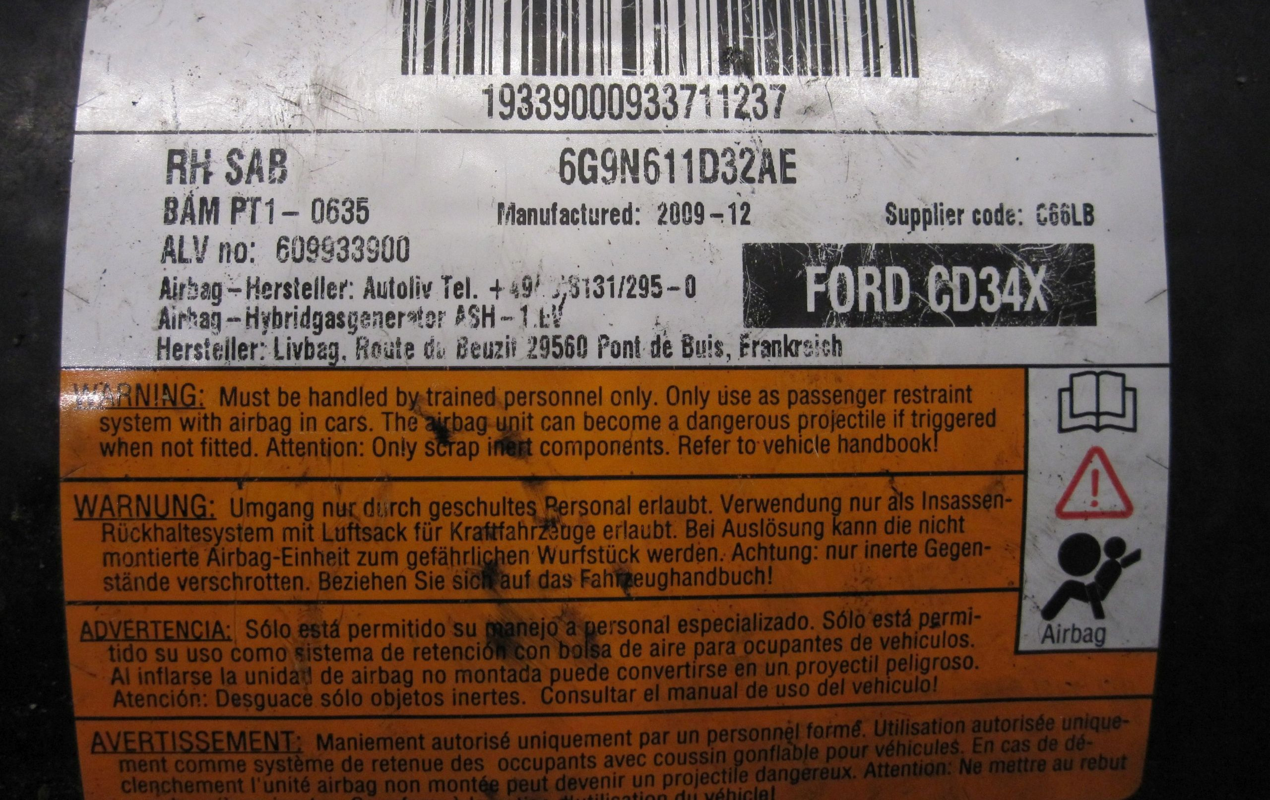 Подушка безопасности в сиденье 6G9N611D32AE Ford S-MAX