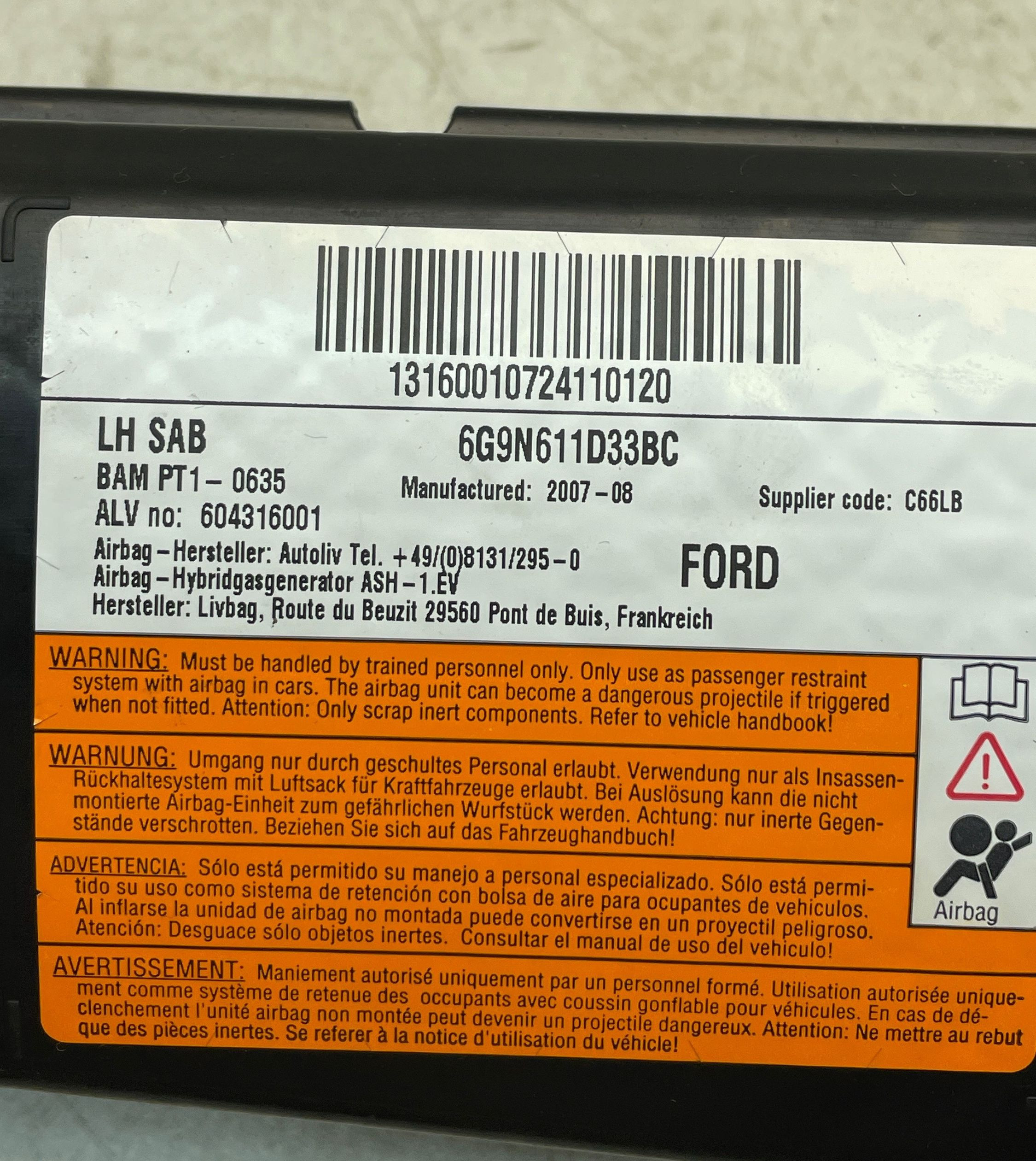 Подушка безопасности в сиденье 6G9N611D33BC, 13160010724110120 Ford S-MAX