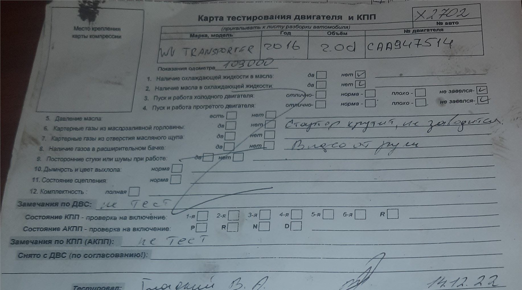 - VIN автомобиля: WV1ZZZ7HZGH145010